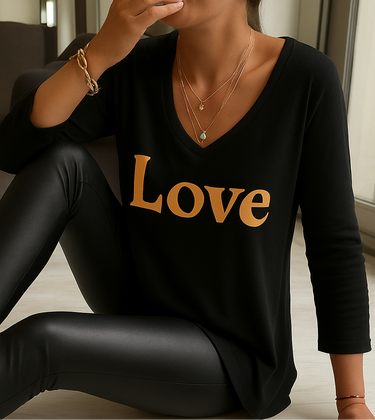Material algodón viscosa estampado en el pecho palabra LOVE en color negro letras naranjas.