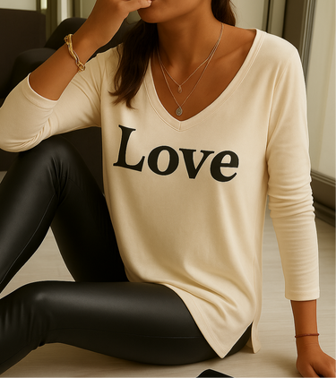 Polera manga larga algodón viscosa color Beige, estampado Love en el pecho talla Única Oversize