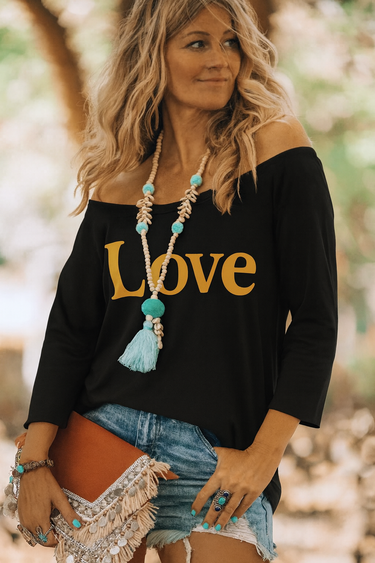 🌟Polera manga larga algodón viscosa color negro estampado en el pecho, cuello bote que permite usar  solo un hombro descubierto o ambos.